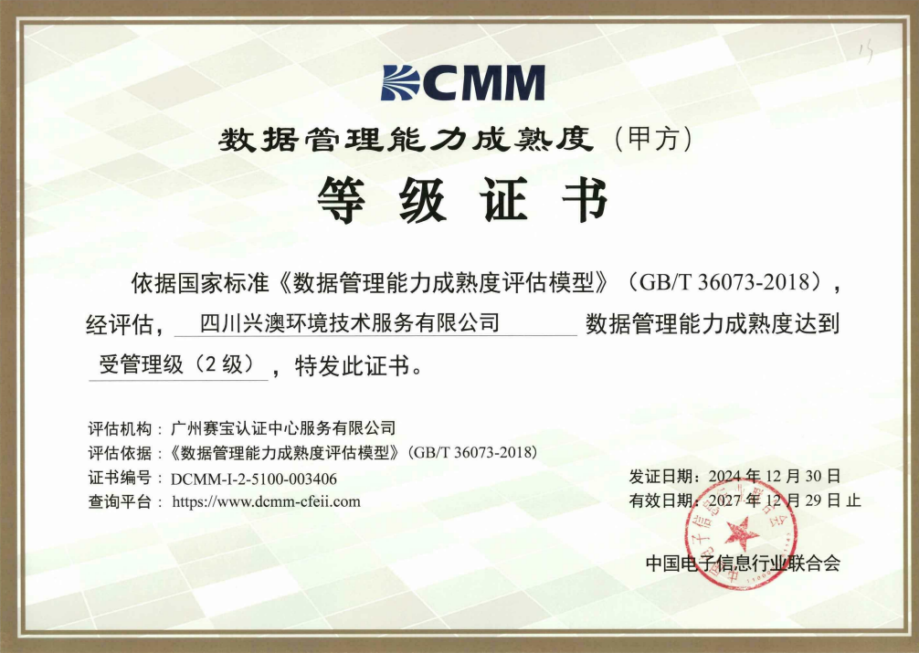 四川兴澳环境技术服务有限公司在2024年12月30日荣获了DCMM(数据管理能力成熟度评估模型)二级证书。这一证书的获得,标志着公司在数据管理方面达到了一定的成熟度和规范性,能够有效支撑业务发展和决策优化。