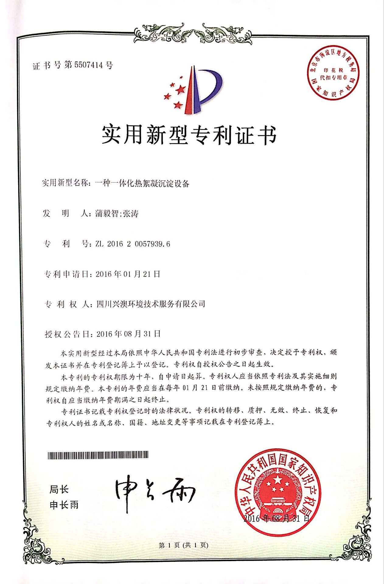 本实用新型涉及一种一体化热絮凝沉淀设备,它包括多个沉淀罐,所述的多个沉淀罐安装在支撑架上,相邻沉淀罐之间通过污水输送管道连接,沉淀罐的下端设置有污泥输送管道,污泥输送管道与污泥地连接,位于最前端的沉淀罐连接污水源和蒸汽源,位于最前端的沉淀罐的侧壁上设置有加热管道和温度监测装置,位于最后端的沉淀罐通过浓水输送管道与浓水调节池连接。本实用新型结构简单、便于制造安装和运输移动,污水处理量大、处理速度快、处理效果好,且设备中引入控制系统,自动化程度高、设备运行安全可靠。