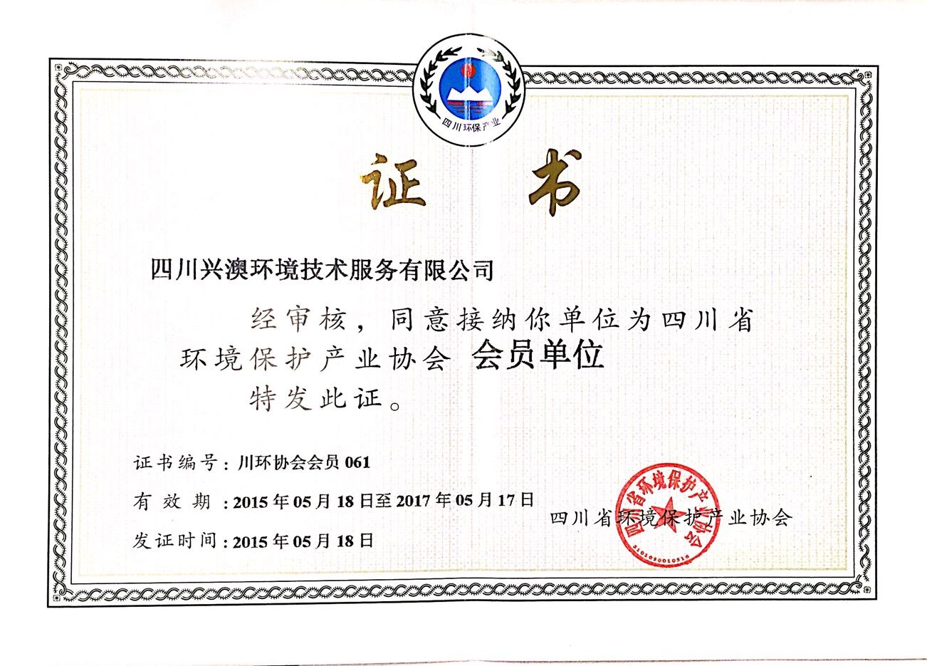 2015年5月18日,四川省环境保护产业协会向我公司颁发了会员证,我公司正式成为该协会会员单位。这意味着我公司在油田污水处理的技术创新实力,以及我公司提供的工程设计、工程承包、系统集成、投融资、运营等环保服务水平,受到业界的一致肯定。