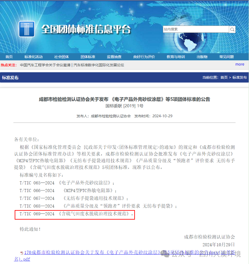 含硫气田废水因其含有大量的硫化物等有害物质,若未经妥善处理直接排放,不仅会对周边的土壤、水体以及生态环境造成严重破坏,影响生态平衡,还可能威胁到人们的身体健康。然而,长期以来,在该领域内缺乏统一、规范且科学全面的治理技术标准,导致不同企业、不同项目在废水脱硫治理过程中,面临着治理水平参差不齐、技术选择缺乏参照等诸多问题。基于当下存在的现实需求,四川兴澳环境技术服务有限公司汇聚行业内的专家、学者以及众多相关企业的精英力量,经过深入调研、反复论证以及严谨试验,制定出了这一极具针对性和实用性的团体标准。